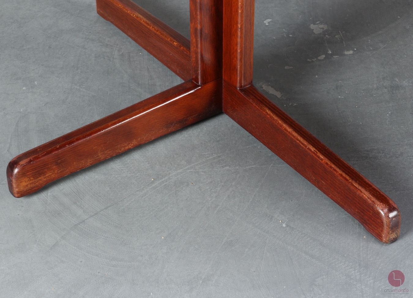 Die Tischplatten sind sind wie das Gestell mahagonifarben gebeizt (TP34). Es befinden sich Lagerspuren in Form von Kratzern an bestimmten Stellen. Des weiteren ist eine Platte seitlich wegen Feuchtigkeit leichte aufgequollen. Das Buchefurnier ist jedoch voll intakt. Insgesamt macht der Tisch trotz Gebrauchsspuren einen schönen Gesamteindruck. Er passt besonders gut zu den welbekannten Thonet Bigholzklassikern. Durch die mahagoni farbenen Beizton lässt sich sehr schön die natürliche Maserung des Buche-Furniers erkennen.