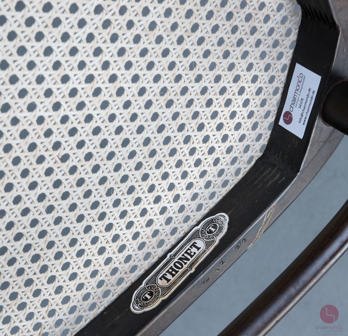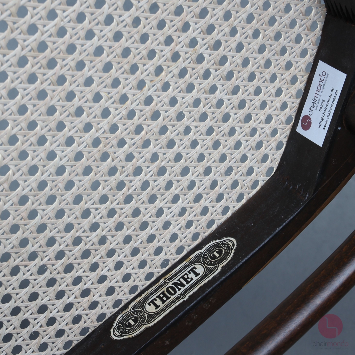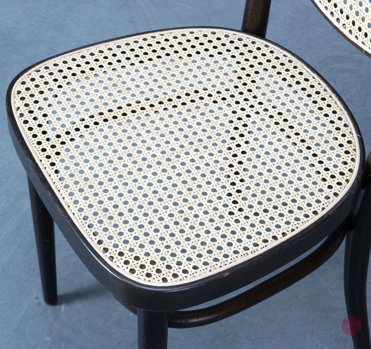 Bei uns erhalten Sie das Modell 215 R in einer schönen Ausführung mit neuem Wiener Geflecht und dunkelbrauner Lackierung. Der Stuhl ist als Variante des 214er zusätzlich mit einer mit Wiener Geflecht bespannten Rückenlehne ausgestattet, die den Stuhl sehr bequem macht.