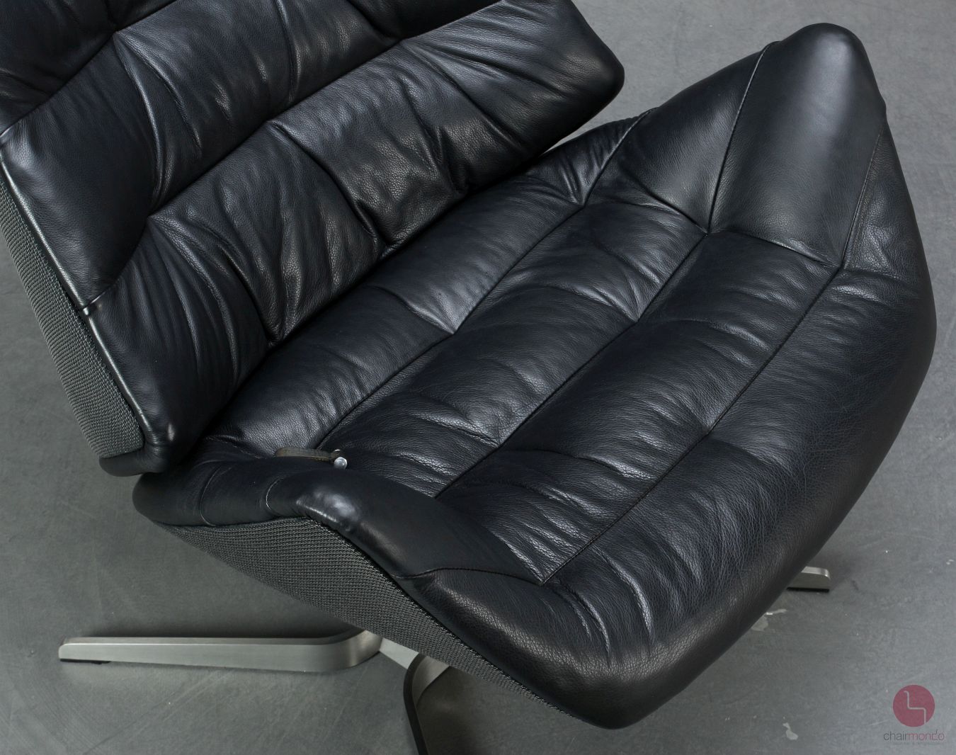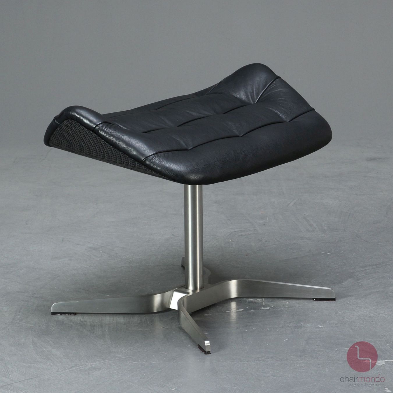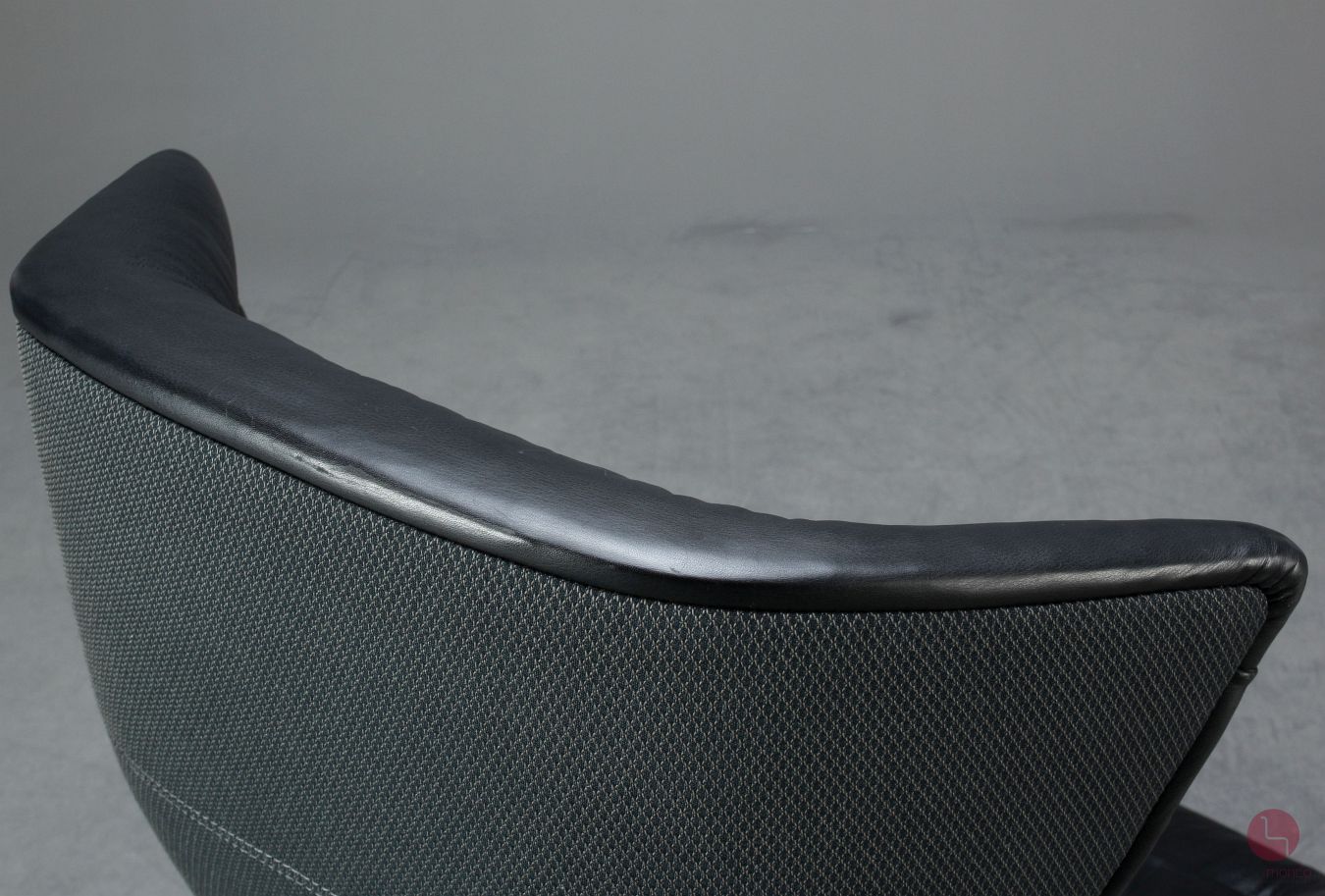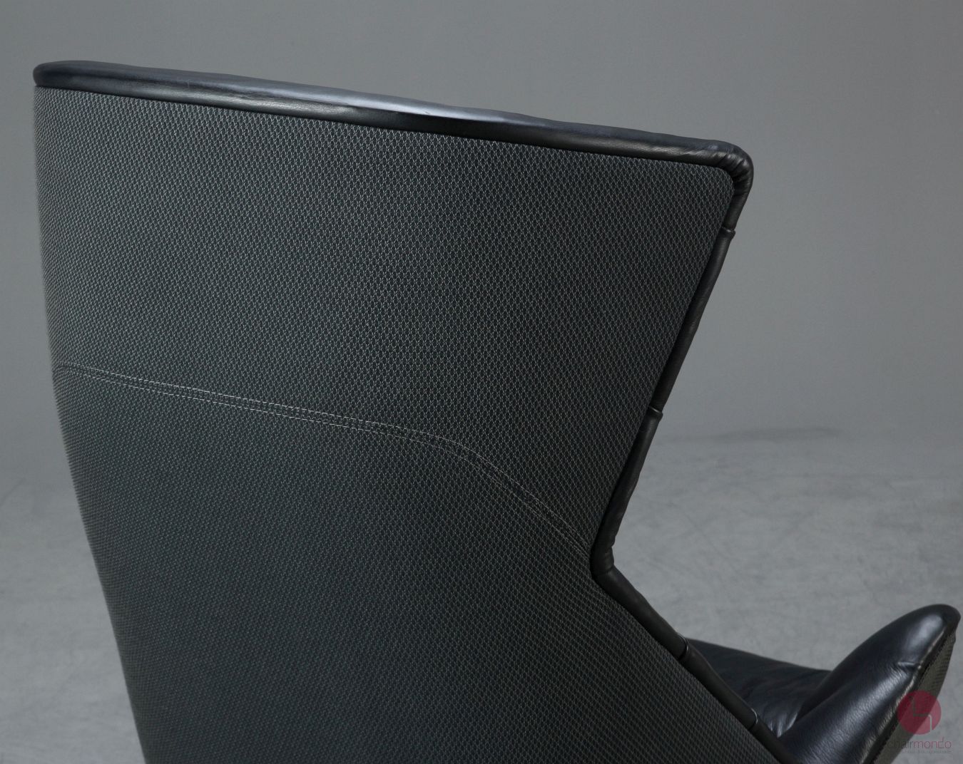 Der Sessel und Ottoman befinden sich in einem sehr guten gebrauchten Zustand. Im Sitzbereich hat das Set einen schwarzen Echtlederbezug. Dieser befindet sich jeweils in einem sehr guten gebrauchten Zustand mit schöner Patina und leichten Gebrauchsspuren. Auf der Außenseite ist ein hochwertiger schwarzer Stoffbezug angebracht. Es handelt sich um einen Stoff der Firma Rohi mit Wabenstruktur. Der Stoffbezug befindet sich in sehr gutem kaum gebrauchten Zustand.