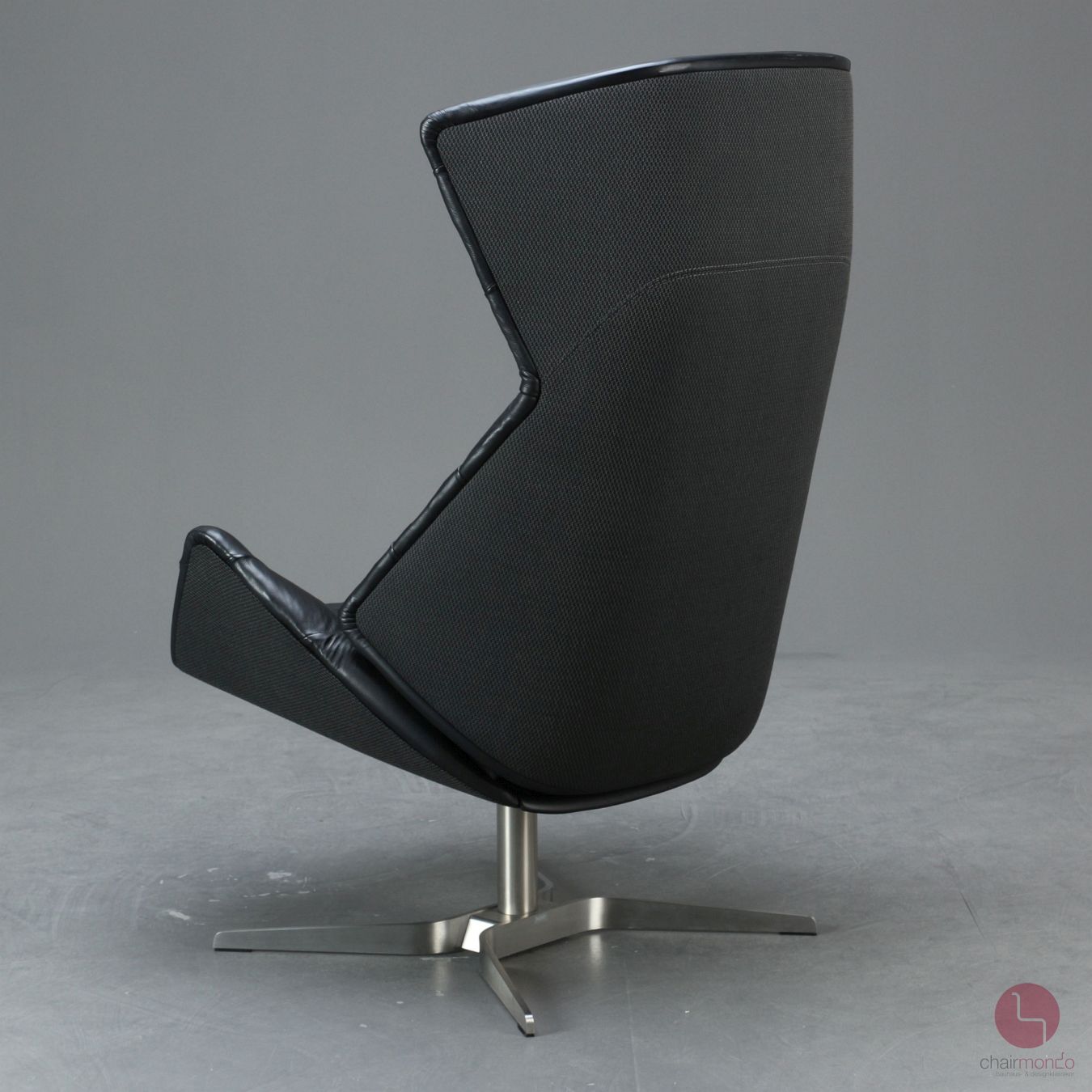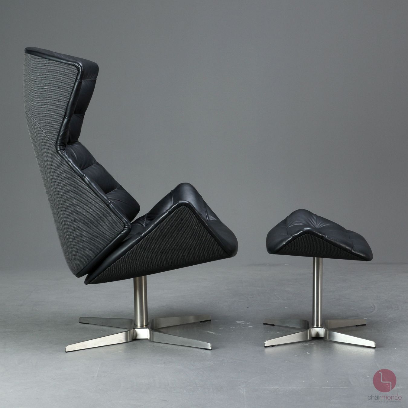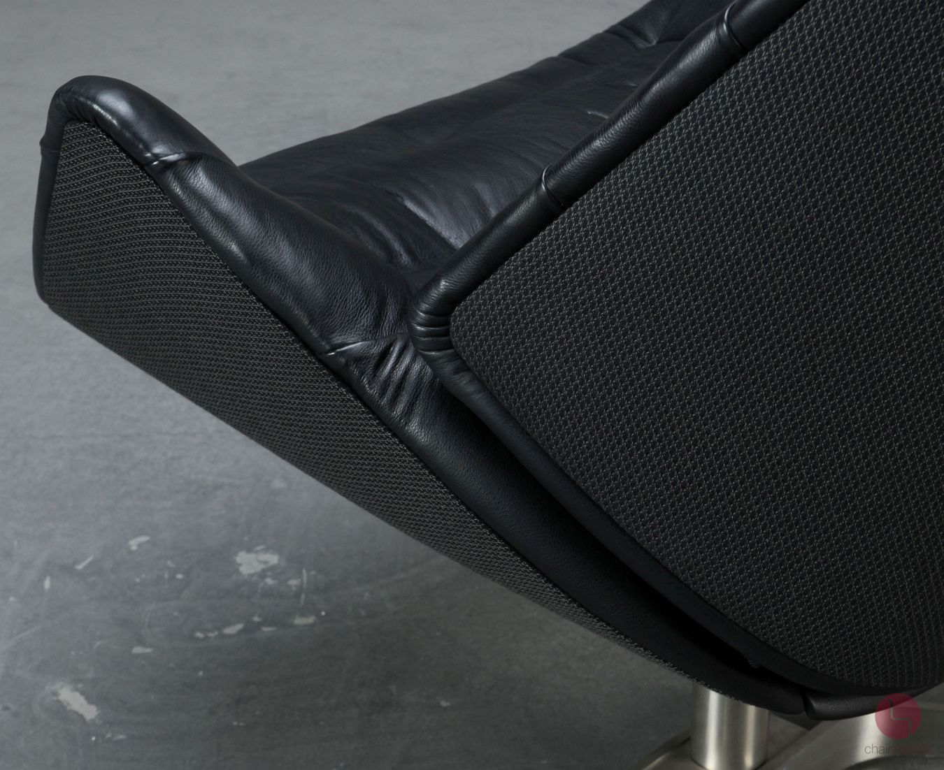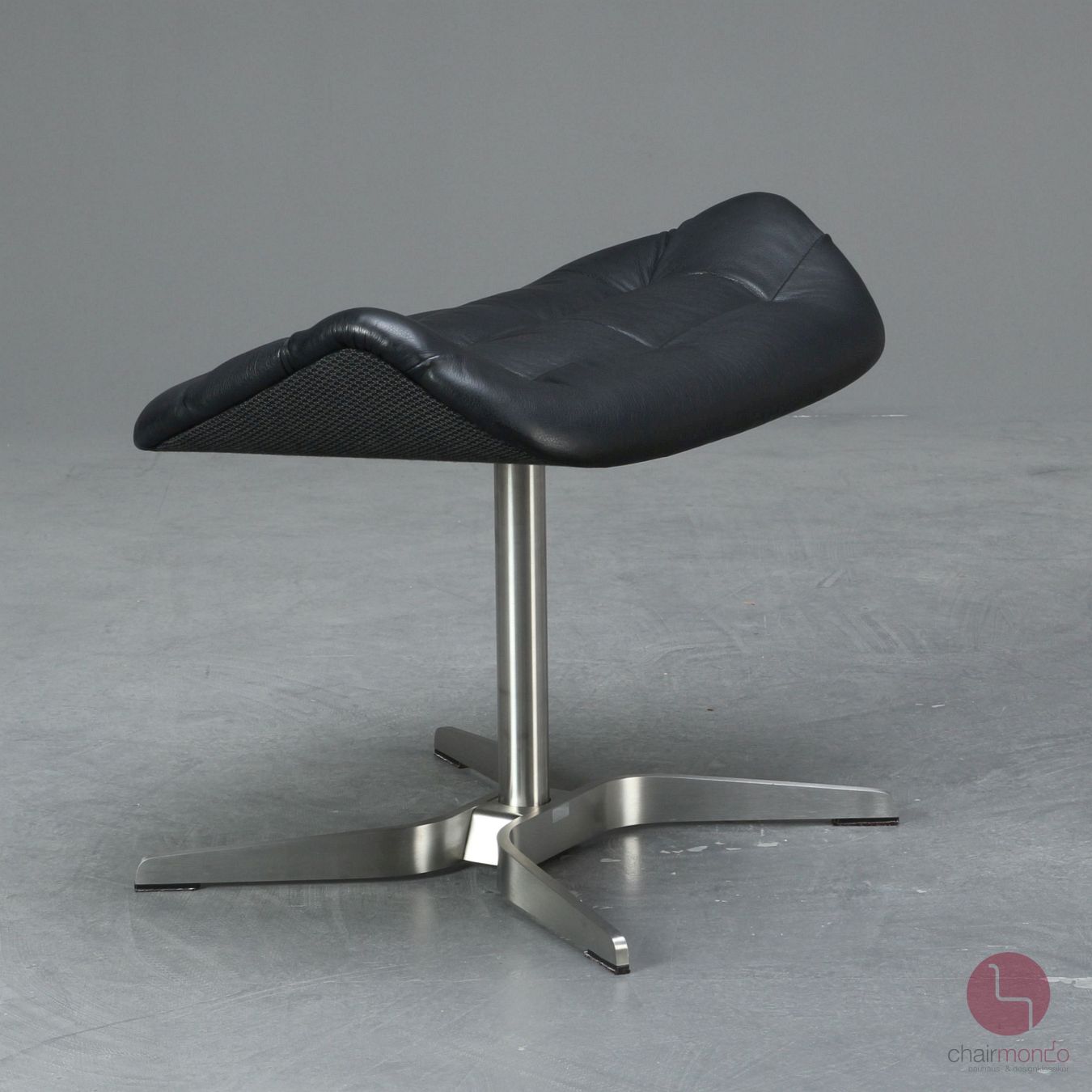Der Sessel und Ottoman befinden sich in einem sehr guten gebrauchten Zustand. Im Sitzbereich hat das Set einen schwarzen Echtlederbezug. Dieser befindet sich jeweils in einem sehr guten gebrauchten Zustand mit schöner Patina und leichten Gebrauchsspuren. Auf der Außenseite ist ein hochwertiger schwarzer Stoffbezug angebracht. Es handelt sich um einen Stoff der Firma Rohi mit Wabenstruktur. Der Stoffbezug befindet sich in sehr gutem kaum gebrauchten Zustand.