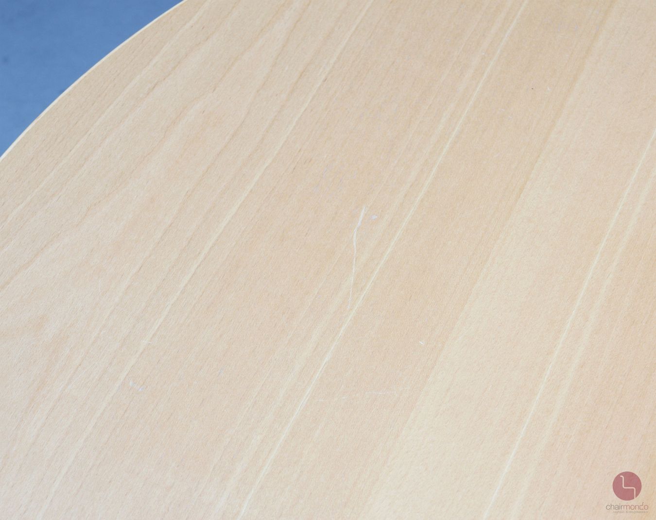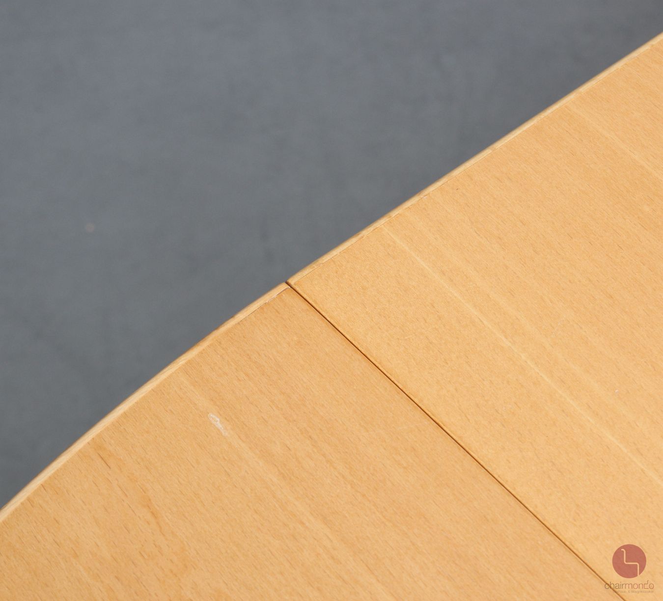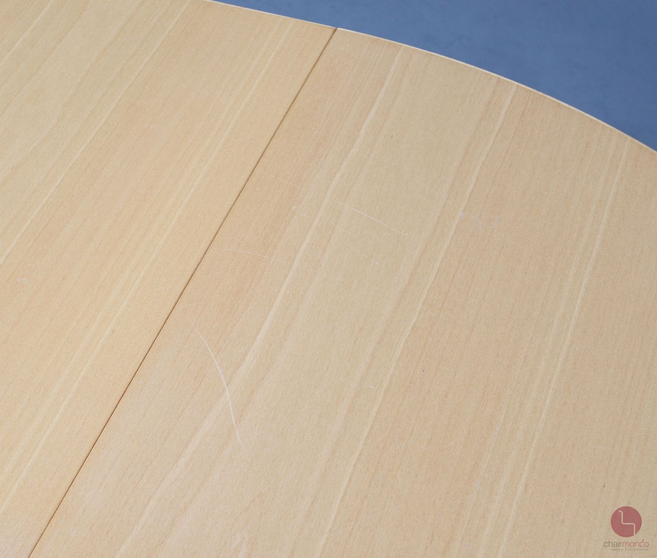 Die Tischplatten sind in Buche Natur ausgeführt (TP17). Dadurch lässt sich sehr schön die natürliche Maserung des Buche-Furniers erkennen. Die Lackierung befindet sich in sehr gutem Zustand mit leichten Gebrauchsspuren. Die Tischplatten weisen in der Mitte eine leichte Verfärbung auf. Insgesamt sind sie in optisch sehr schönem Zustand (siehe Fotos).