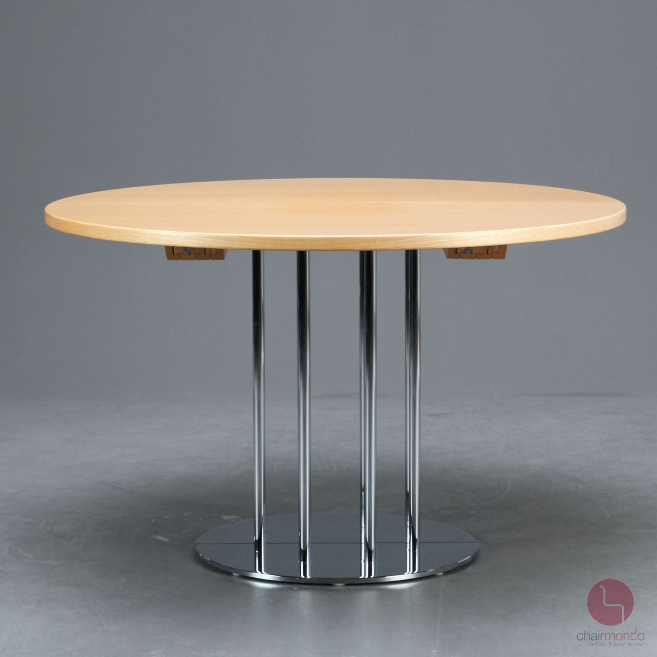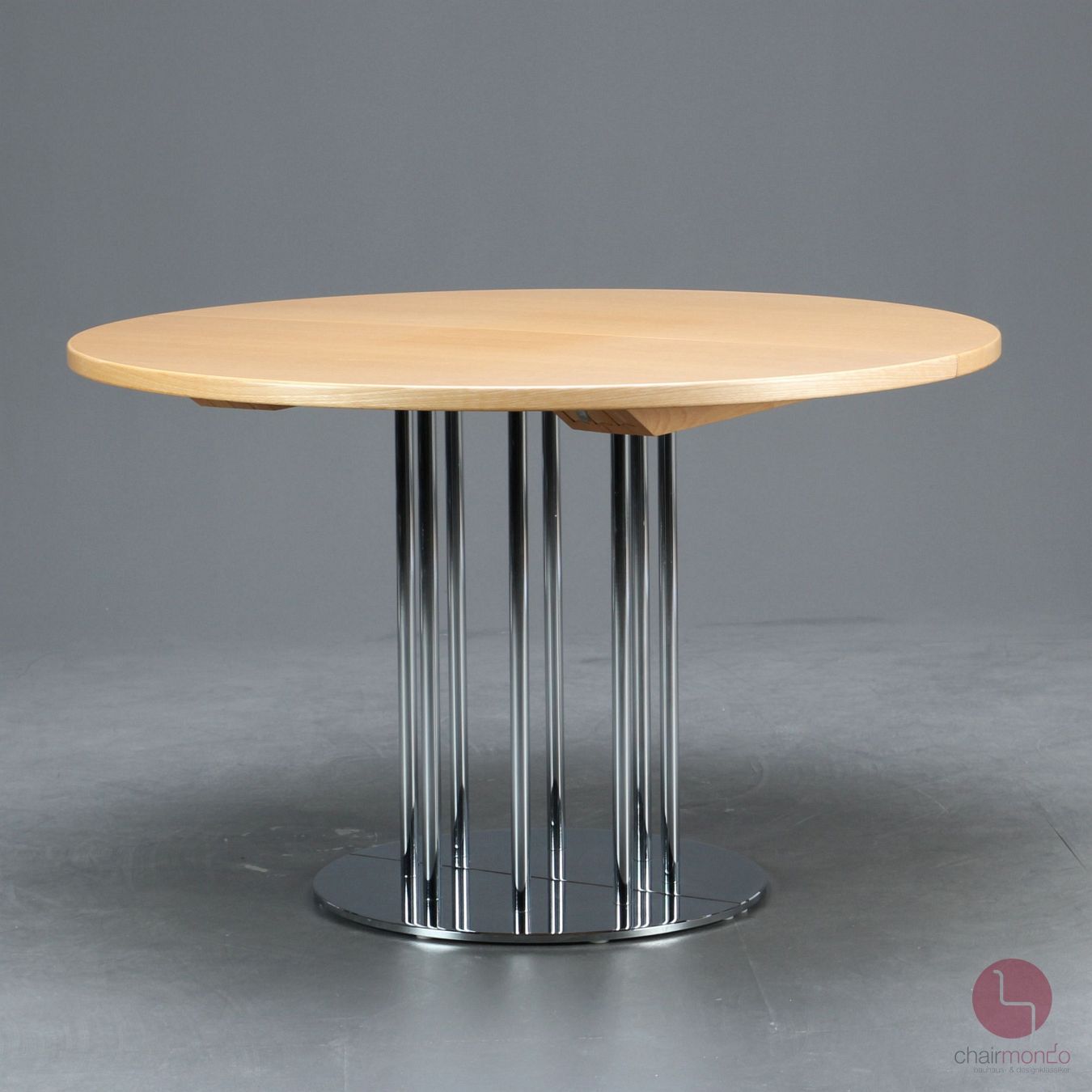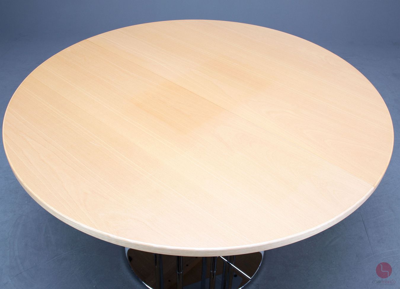 Die zwei Einlegeplatten erweiten den Tisch auf eine Länge von 180 cm bzw 240 cm. Ohne die Einlegeplatten erhält man einen runden Tisch mit 120 cm Durchmesser. Der Tisch ist damit für die unterschiedlichsten Zwecke praktisch einsetzbar. Er passt besonders gut zu den weltbekannen Thonet Freischwingern. (siehe Fotos)
