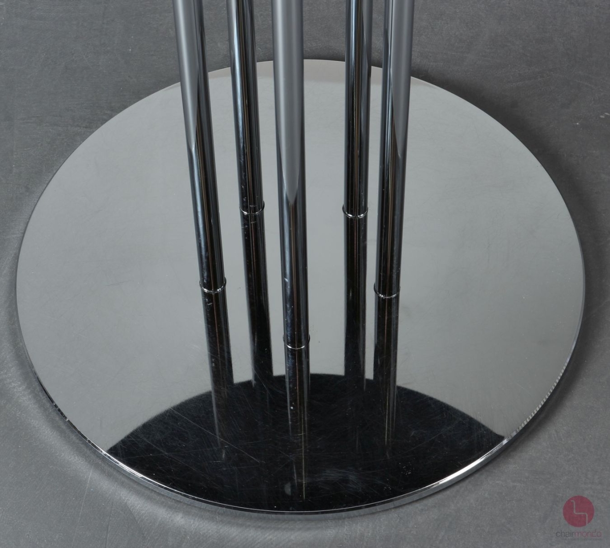 Die Tische befinden sich in einem sehr guten, gebrauchten Zustand. Sie stammen in etwa aus dem Herstellungsjahr um 1990. Als Unterbau hat der Bistrotisch ein hochwertiges, verchromtes Stahlrohrgestell mit mehreren Säulen. Es befindet sich jeweils in gutem gebrauchten Zustand und glänzt wunderbar. Es befinden sich dem Alter entsprechend Gebrauchsspuren am Chrom (siehe Fotos).