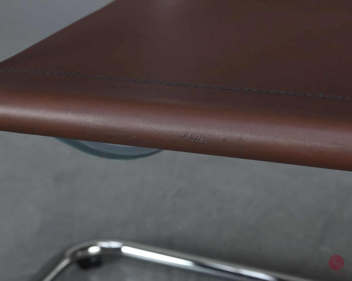 Das verchromte Stahlrohrgestell befindet sich in sehr gutem gebrauchten Zustand und glänzt wunderbar. Es stammt wie auch die Armlehnen in etwa aus dem Herstellungsjahr um 2000. Es sind bereits vier transluzente Filzgleiter an dem Stuhl angebracht, die eine Benutzung auch auf empfindlichen Böden ermöglichen.