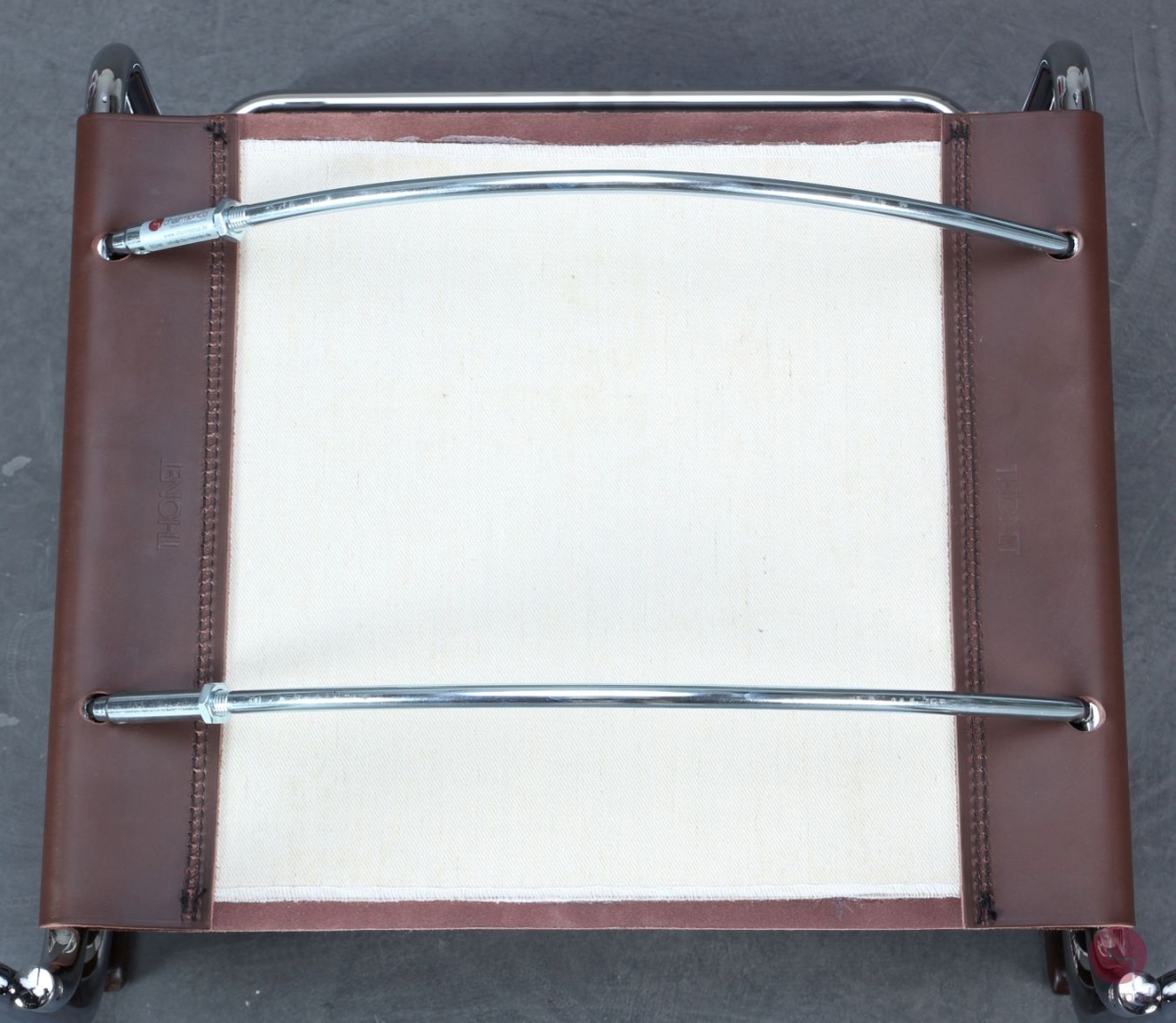 Der Stuhl befindet sich in einem sehr guten, nahezu neuwertigem Zustand. Das schoko- braune Kernleder wurde vor kurzer Zeit erneuert und hat noch keine Gebrauchsspuren. Es handelt sich um eine sehr schöne Leder Ausführung, die hervoragend zu diesem Thonet Klassiker passt. Die Thonet Kernleder Garnitur wurde 2023 durch eine komplett neue ersetzt. Sie ist stramm gespannt und bisher unbenutzt. Die Armlehnen wurden ebenfalls komplett erneuert und sind in neuwertigem Zustand. Es handelt sich um hochwertige Wenge-Armlehnen, die heute so nicht zu bekommen sind.