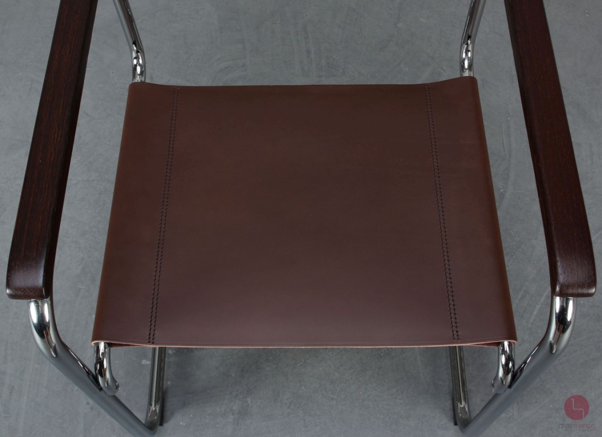 Bei uns erhalten Sie den Freischwinger Modell S34 in der seltenen Ausführng mit verchromten Gestell, braunem Kernleder und Wenge-Holz Armlehnen.