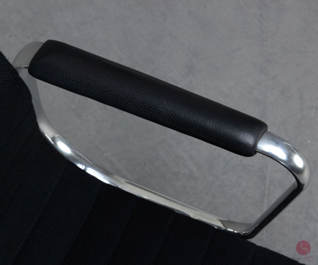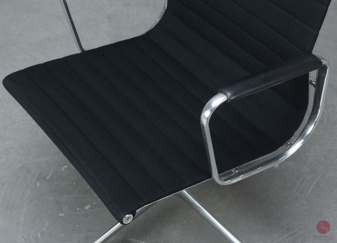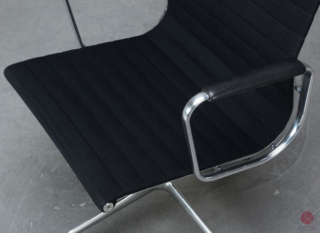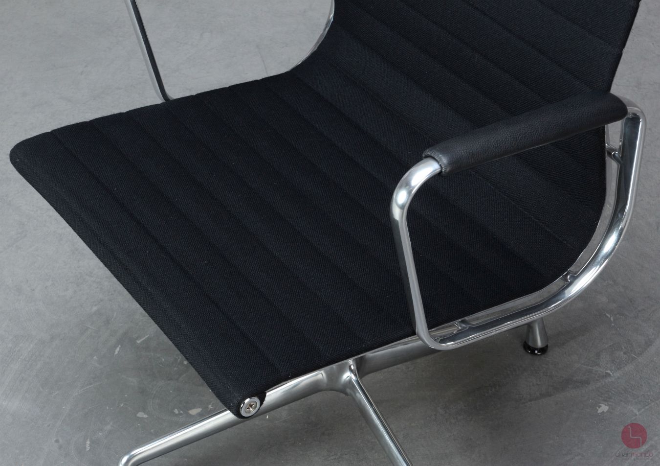 Bei uns erhalten Sie den Designklassiker in der Ausführung mit schwarzem Hopsak Bezug, Lederarmauflagen und Aluminium poliert.