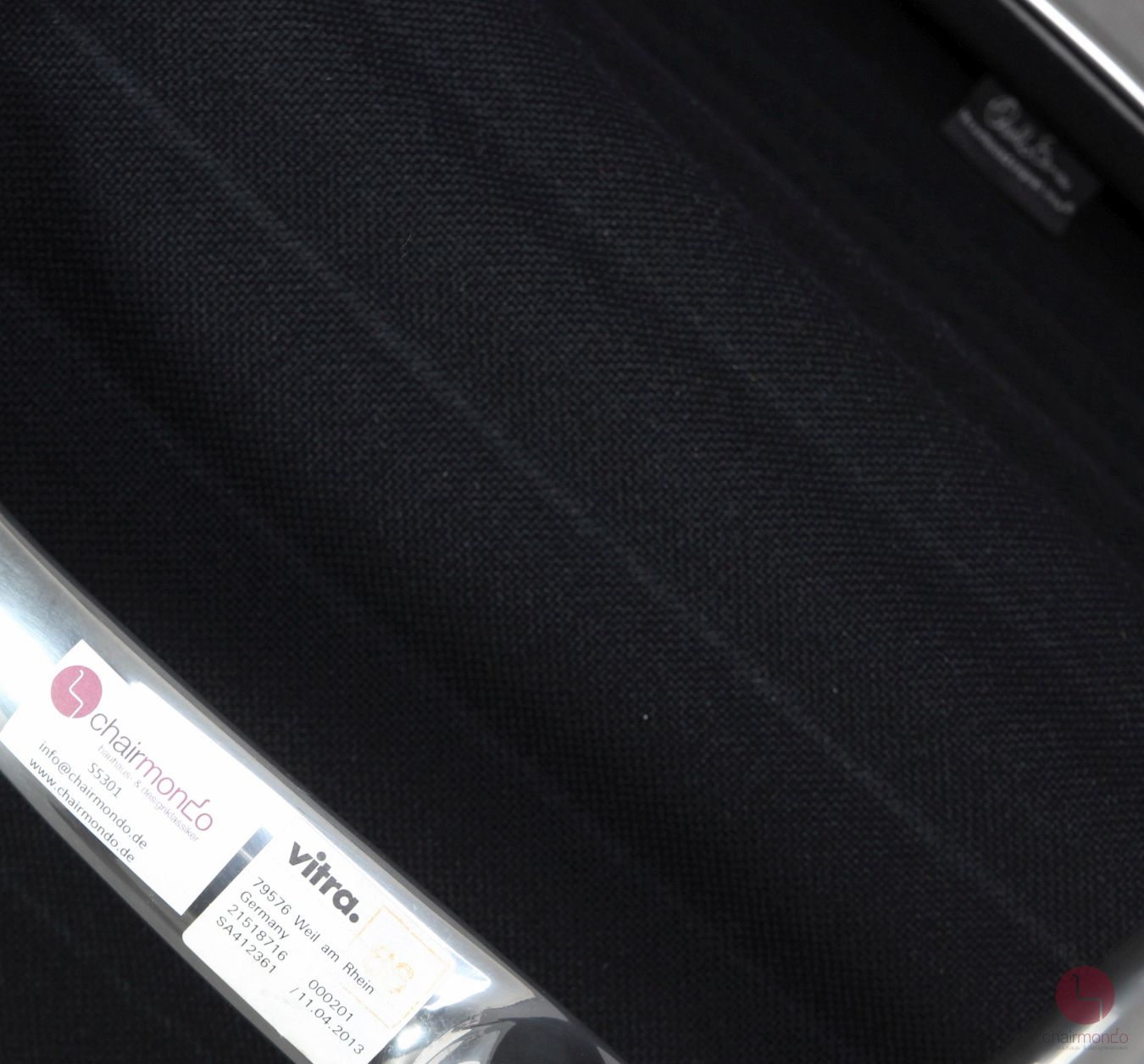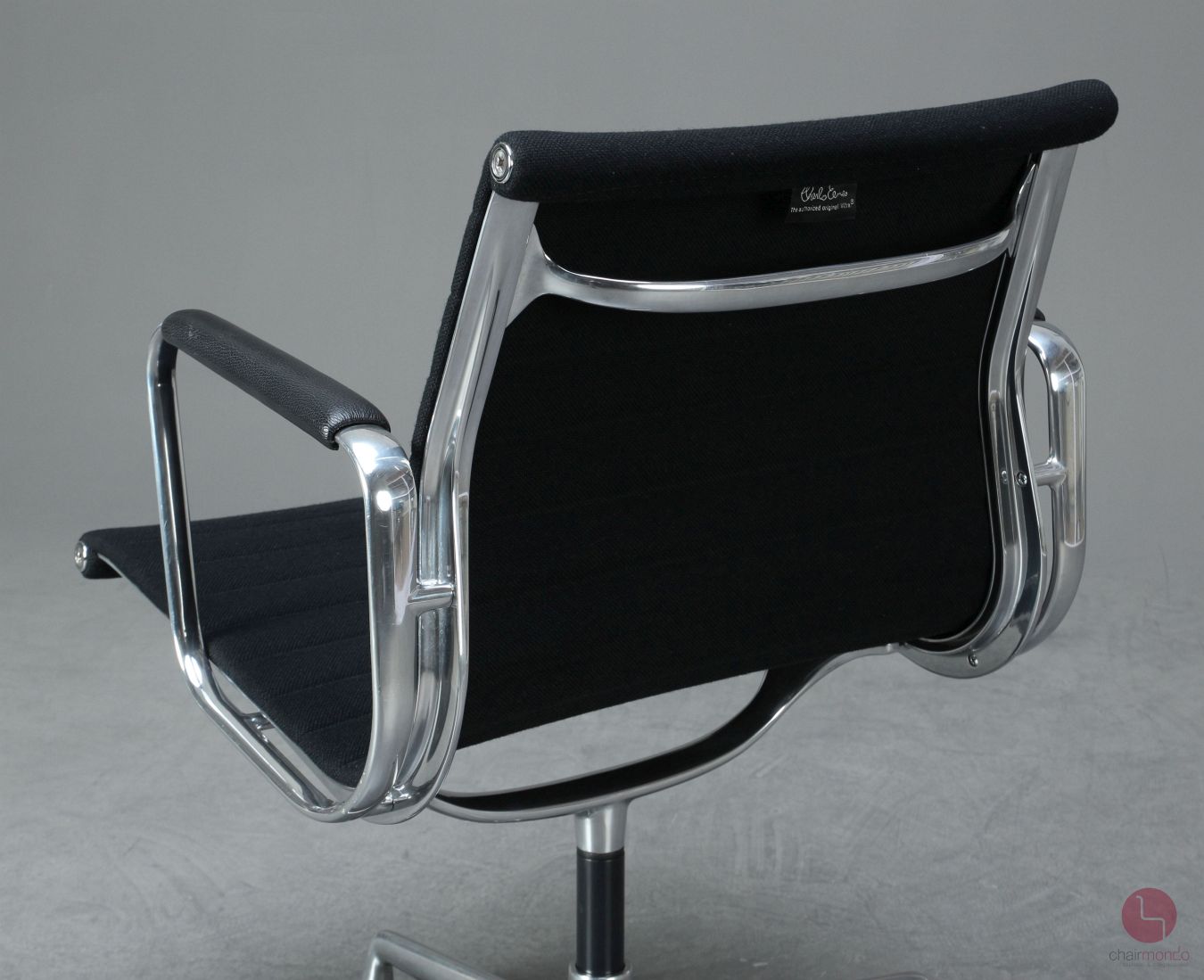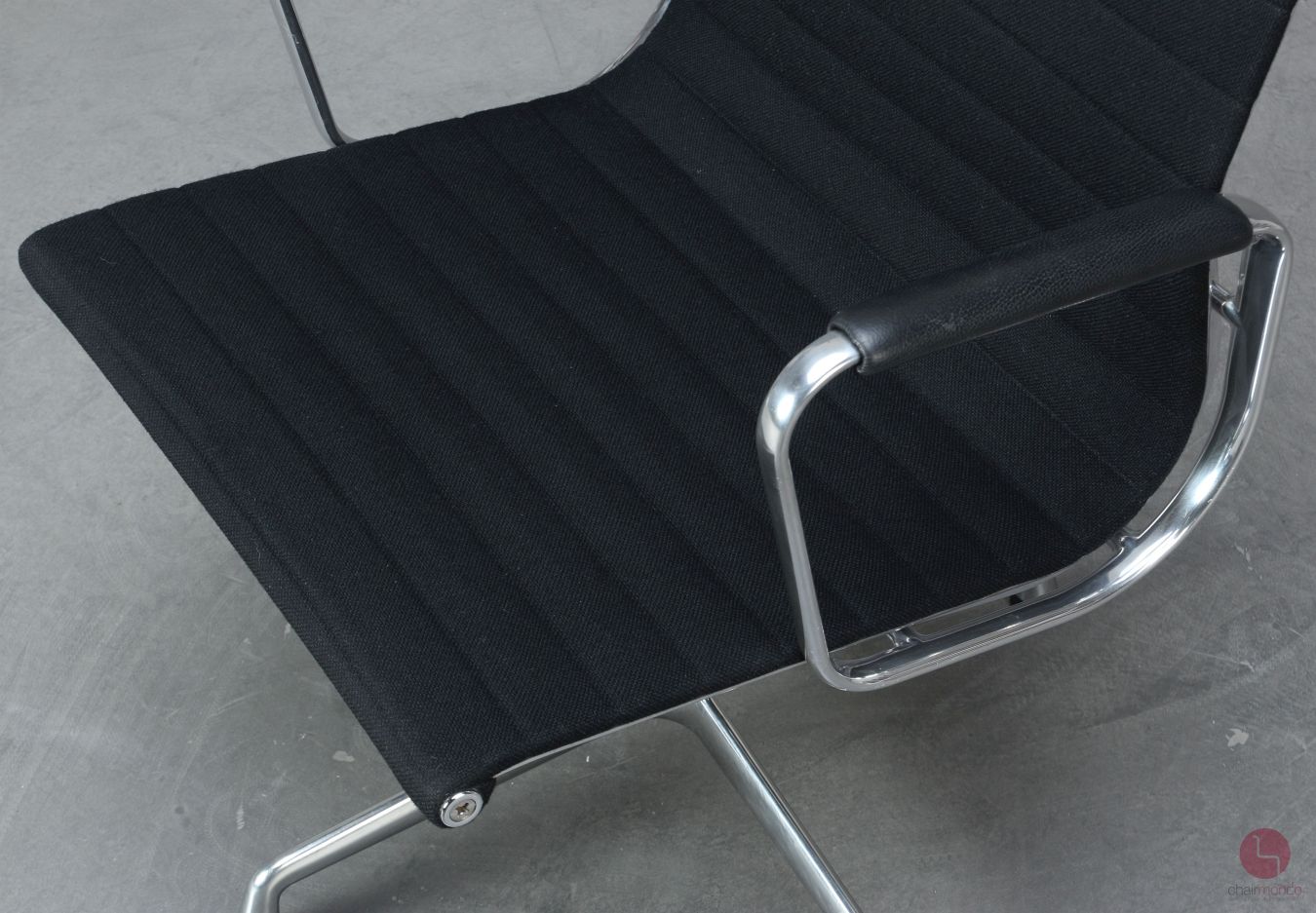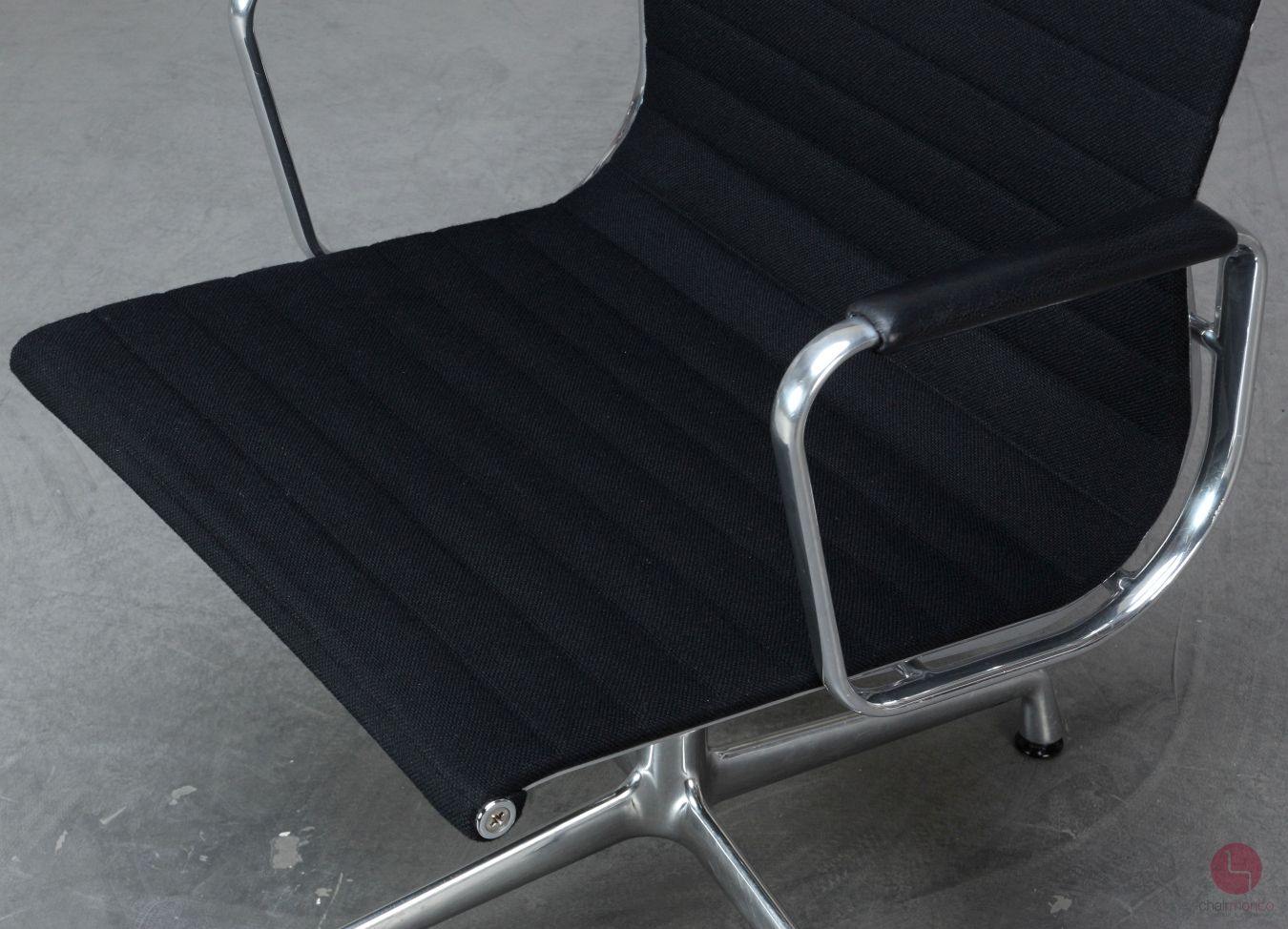 Bei uns erhalten Sie den Designklassiker in der Ausführung mit schwarzem Hopsak Bezug, Lederarmauflagen und Aluminium poliert.