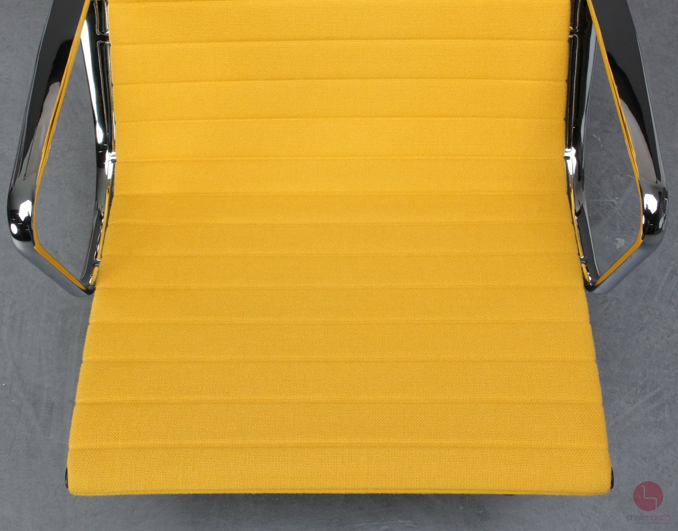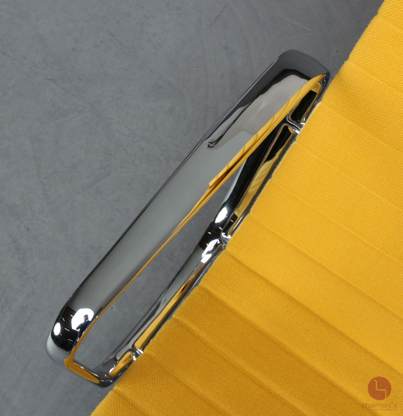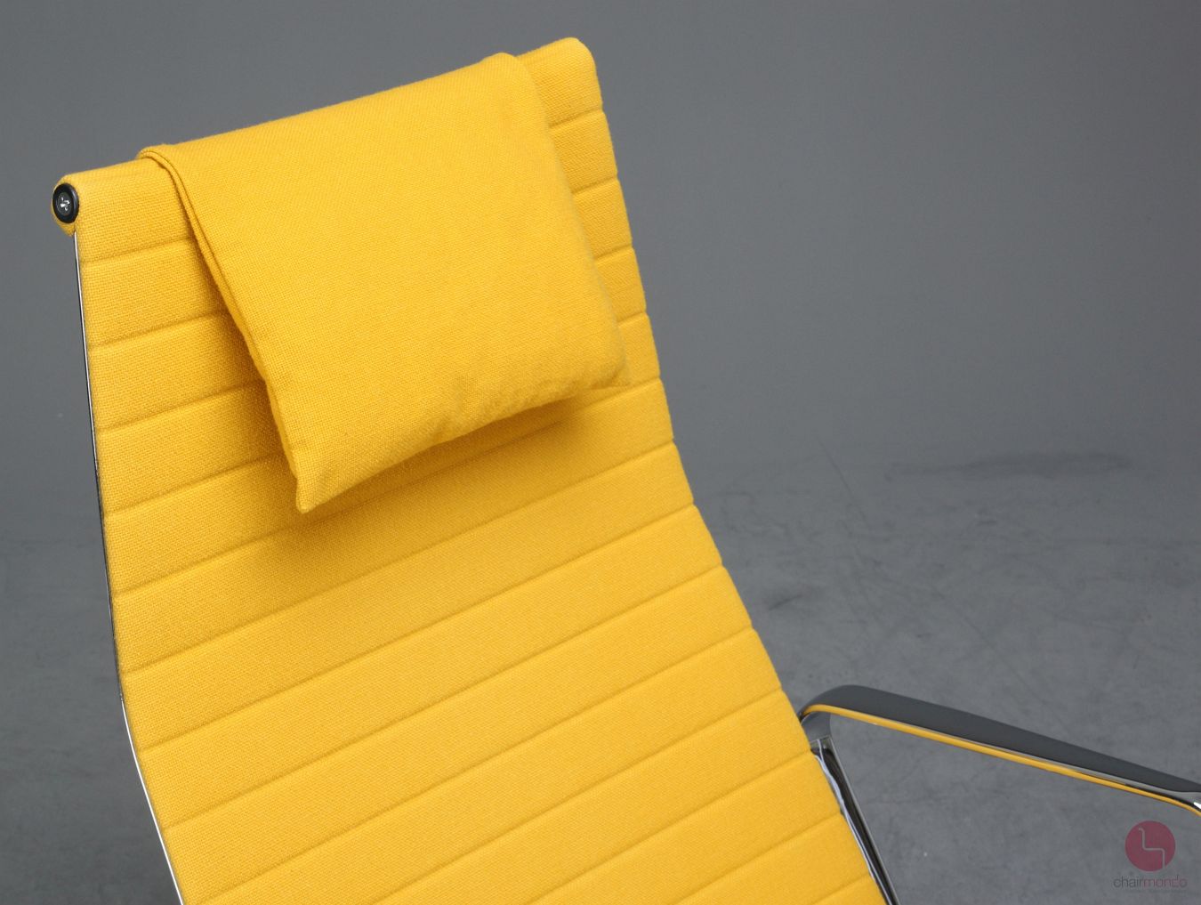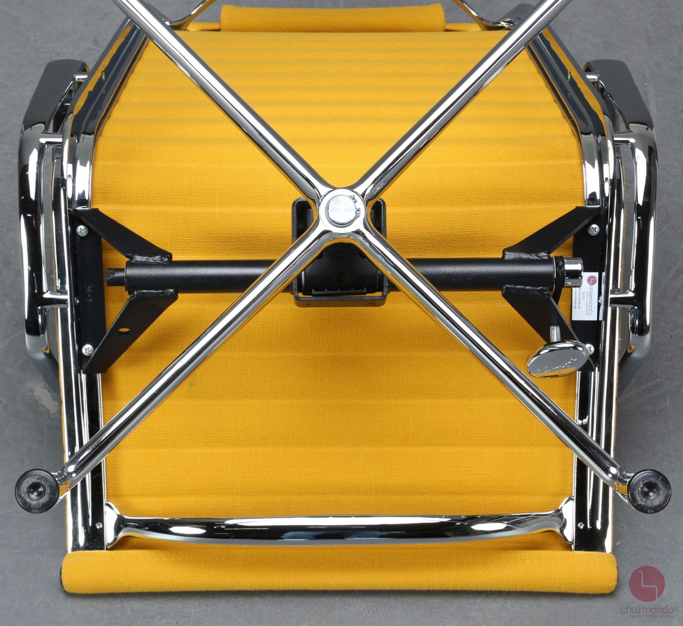 Das verchromte Aluminium Gestell befindet sich in sehr gutem Zustand und glänzt wunderbar. An Hand einer Wippe lässt sich die Rückenlehne nach hinten neigen. Der Sessel macht mit seinem gelben Hopsak Stoff einen wunderschönen Gesamteindruck und ist sofort einsatzbereit.