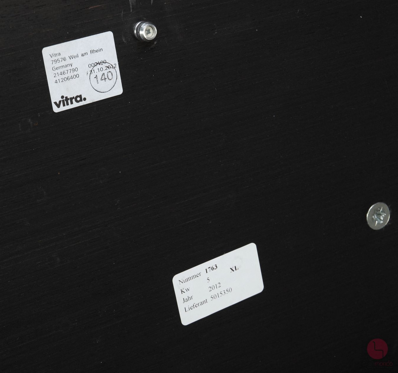 Der Sessel stammt aus dem Produktionsjahr 2012. Die Aufkleber mit Baujahr befinden sich in der Sitzschale unter dem Lederpolster. Auf der Unterseite ist die original Vitra Plakette vorhanden. Es handelt sich um die XL Ausführung des Klassikers, die Eine Rückenlehnenhöhe von 89 cm hat.