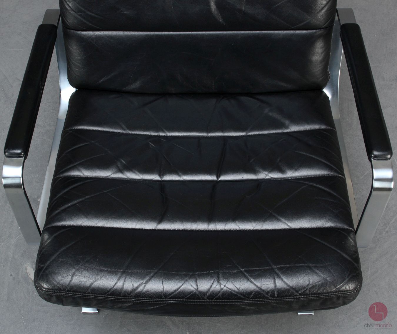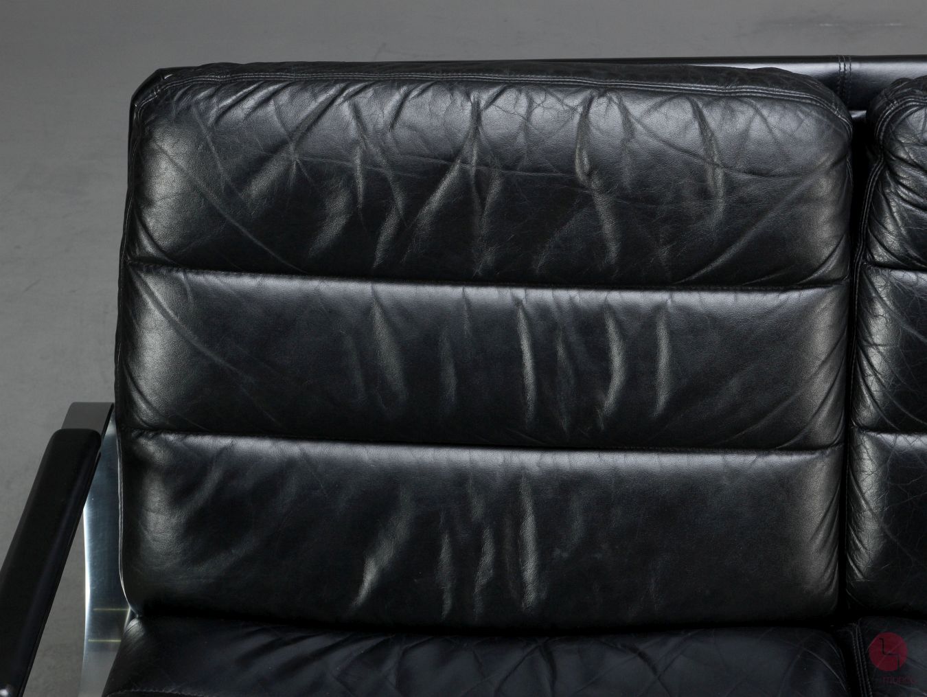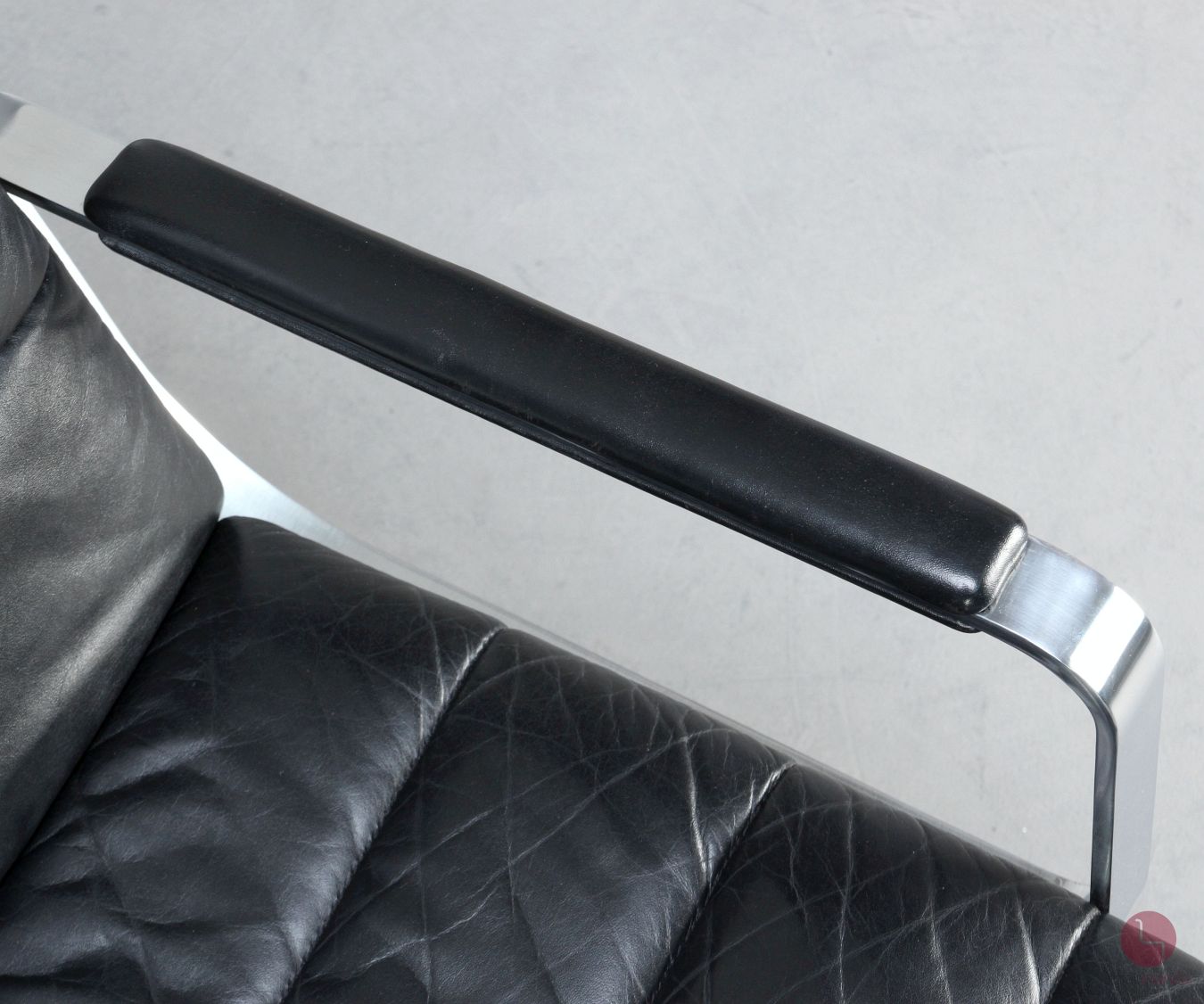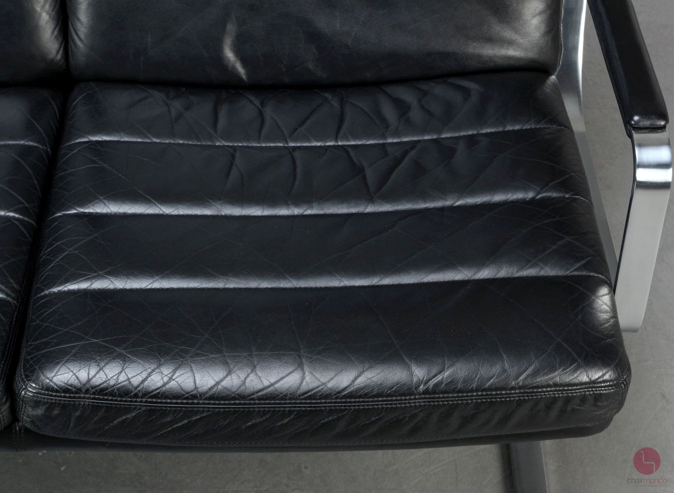 Walter Knoll - Economy Lounge Garnitur Bernd Münzebrock entwarf Anfang der der 1970er Jahre diese Sitzgarnitur und weitere Sitzmöbel für den bekannten Design Möbelhersteller Walter Knoll. Die charakteristisch geformten Fußgestelle und die Armlehnen sind aus hochwertigem poliertem Edelstahl gefertigt. Die Sitz- und Rückenlehne sind mit schwarzen Leder bezogen. Der zugehörige Couchtisch hat eine schöne Rauchglasplatte - ganz im Stile der 1970er Jahre.
