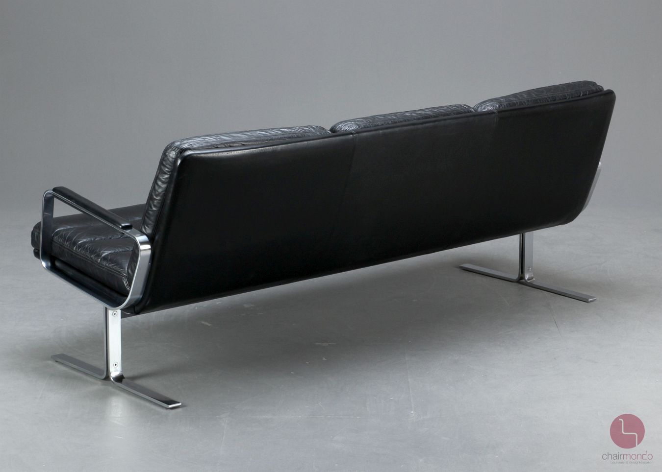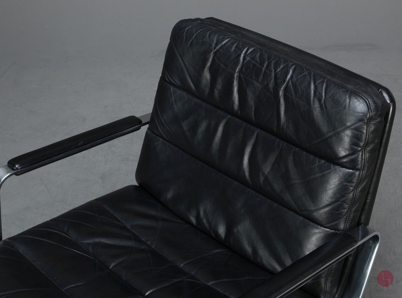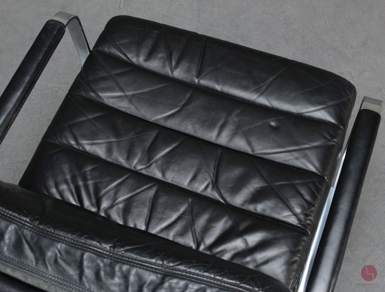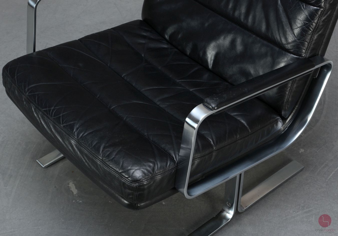 Walter Knoll - Economy Lounge Garnitur Bernd Münzebrock entwarf Anfang der der 1970er Jahre diese Sitzgarnitur und weitere Sitzmöbel für den bekannten Design Möbelhersteller Walter Knoll. Die charakteristisch geformten Fußgestelle und die Armlehnen sind aus hochwertigem poliertem Edelstahl gefertigt. Die Sitz- und Rückenlehne sind mit schwarzen Leder bezogen. Der zugehörige Couchtisch hat eine schöne Rauchglasplatte - ganz im Stile der 1970er Jahre.